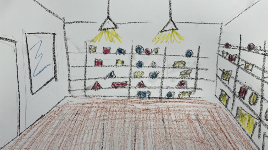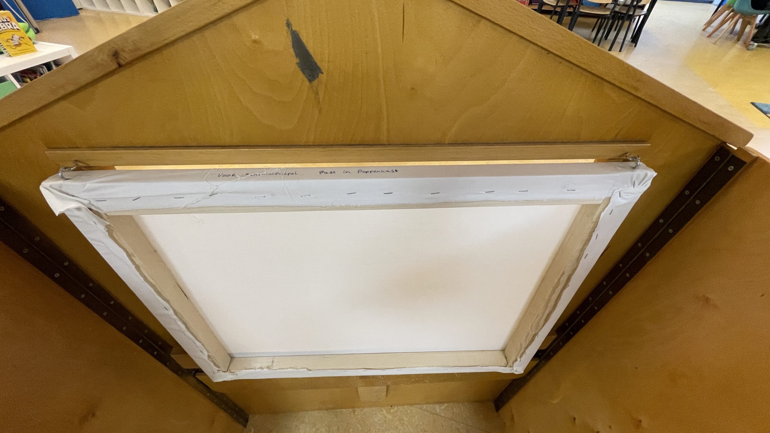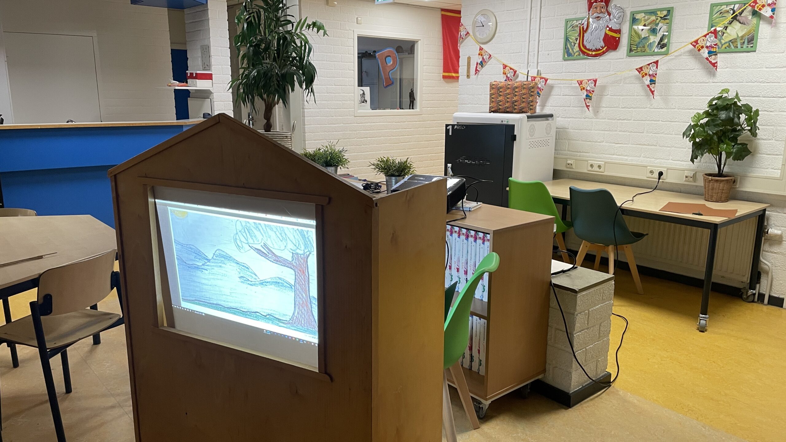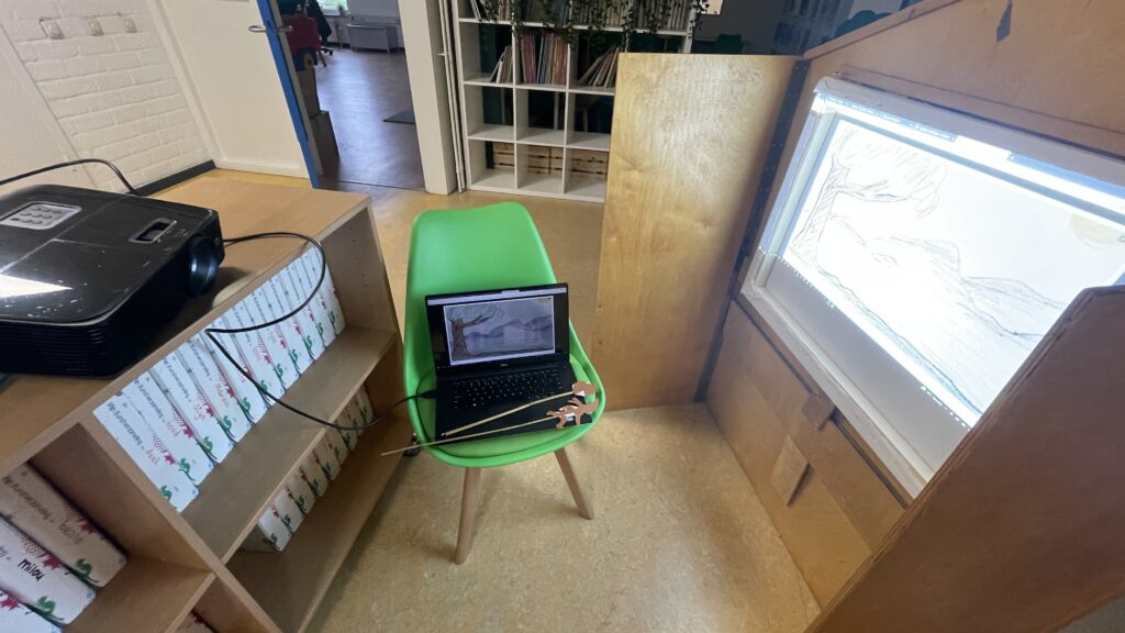 Kinderen maken een tekening van de achtergronden. Deze wordt gefotografeerd en met een beamer op het doek geprojecteerd. De tekening mag op A3 of A4 maar altijd in landschapsstand.