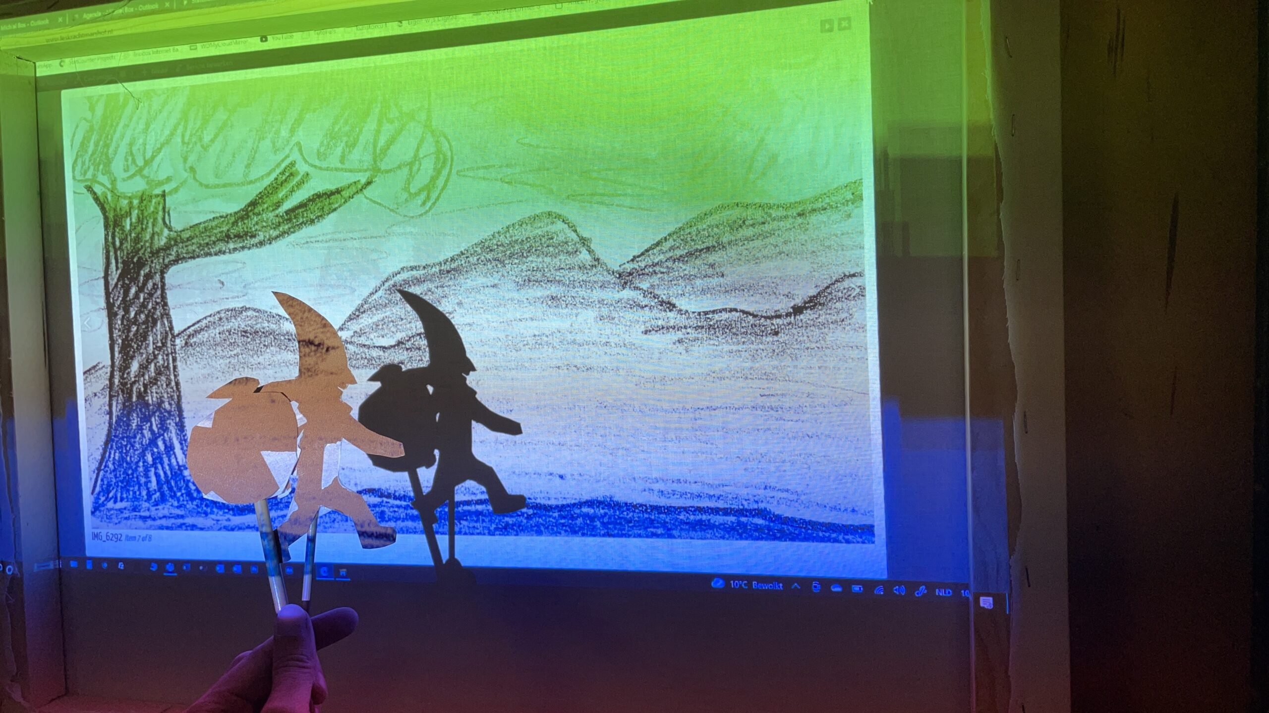 Voor het schimmenspel hebben we en verhaaltje nodig, ongeveer 2 tot 3 personages en drie achtergronden.
